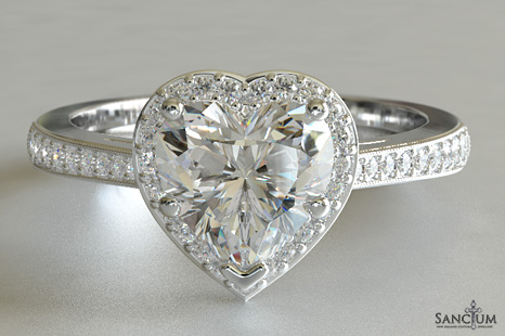 Classic Style Engagement Ring with Heart cut Diamond A classic style diamond engagement ring with 1ct heart shaped diamond and halo of small round cut diamonds - features vintage style milling, in white gold or platinum Ref: Engagement Ring 120009D-28