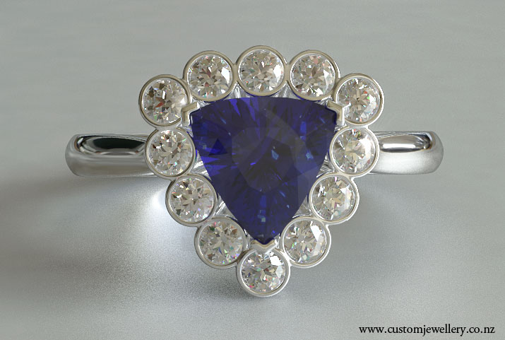 Trillion Sapphire and Diamond Engagement Ring A trillion sapphire and diamond engagement ring. The main trillion cut center sapphire is surrounded by a halo of round brilliant bezel set stones, in white gold or platinum Ref: Engagement Rings 130084SP-275